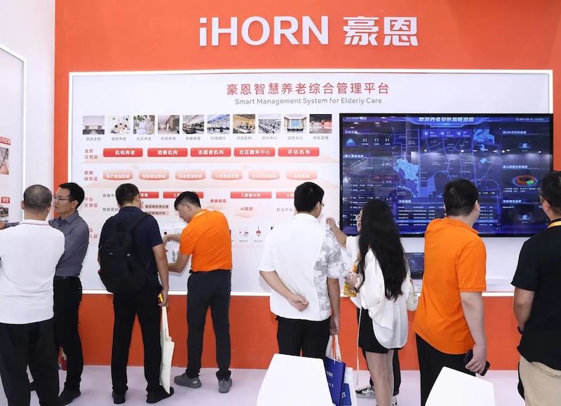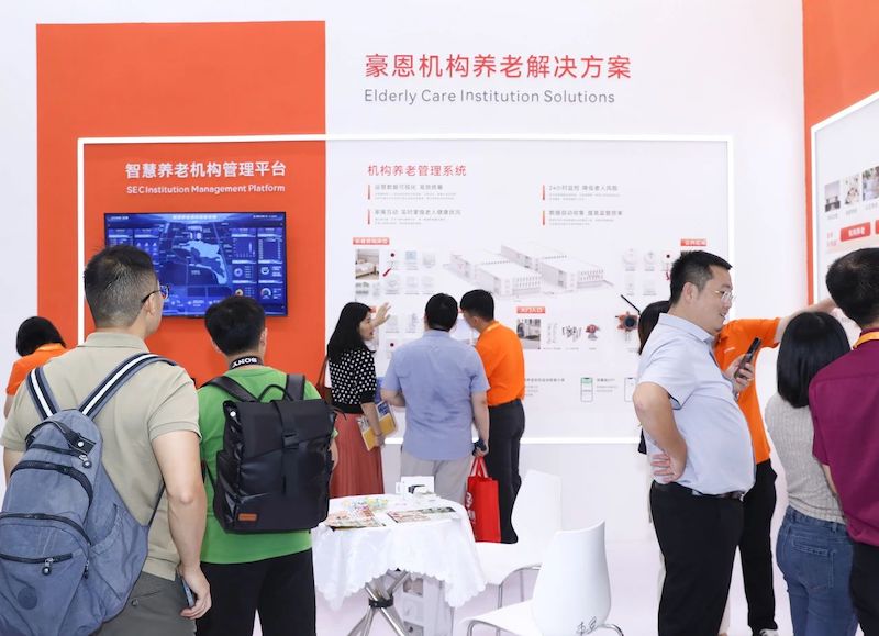 In Hall 4, Booth 4D60, Haoen's orange booth was unique, displaying three major exhibition areas, namely, Intelligent Elderly Comprehensive Management Platform, Community + Home Elderly Solution, and Institutional Elderly Solution, which attracted many enterprises and experts in the industry to visit.