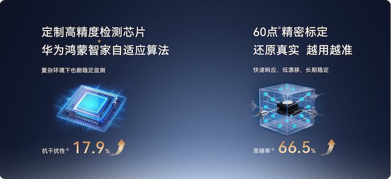 High-precision detection chips equipped with Huawei HarmonyOS Smart Home adaptive algorithms perform real-time compensation and fusion processing for each sensor signal. This ensures stable detection even in complex environments, with interference resistance improved by 17.9%*.