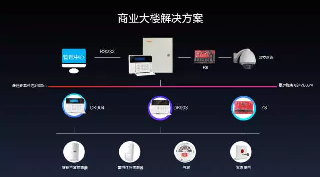 商業(yè)大樓解決方案,商業(yè)大樓的用戶需要各自控制自己的設備,公共區(qū)域的入侵防范由物業(yè)統(tǒng)一管理。每個商廈用戶安裝一臺LCD分區(qū)鍵盤或者LED分區(qū)鍵盤,控制自己的設備,在公共區(qū)域使用八防區(qū)擴展模塊將公共區(qū)域連接在一起,由管理中心統(tǒng)一控制。