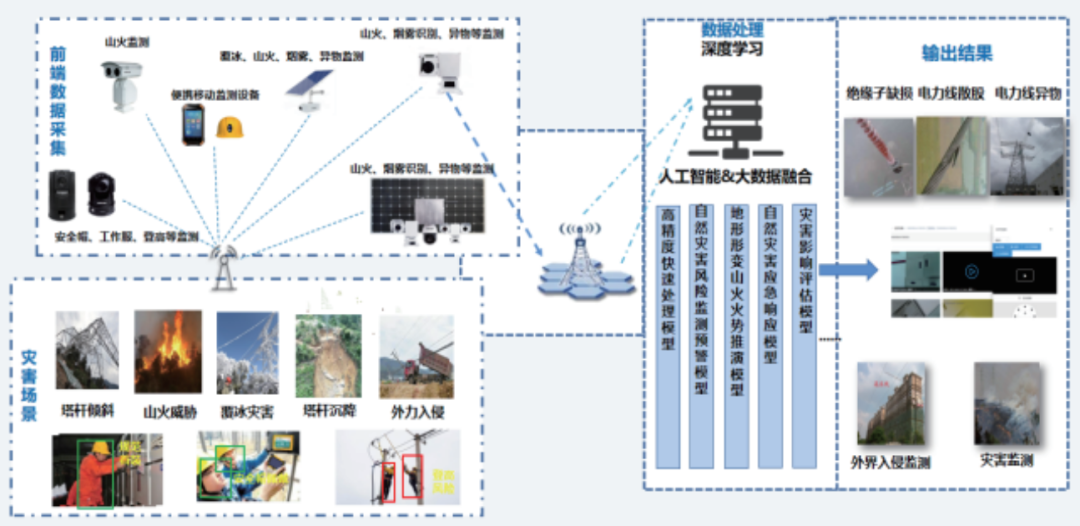輸電線路可視化 AI 終端設備可以實現(xiàn)輸電線路通道環(huán)境、隱患部位、設備狀態(tài)、作業(yè)現(xiàn)場、應急搶修、山火防范六個可視化。