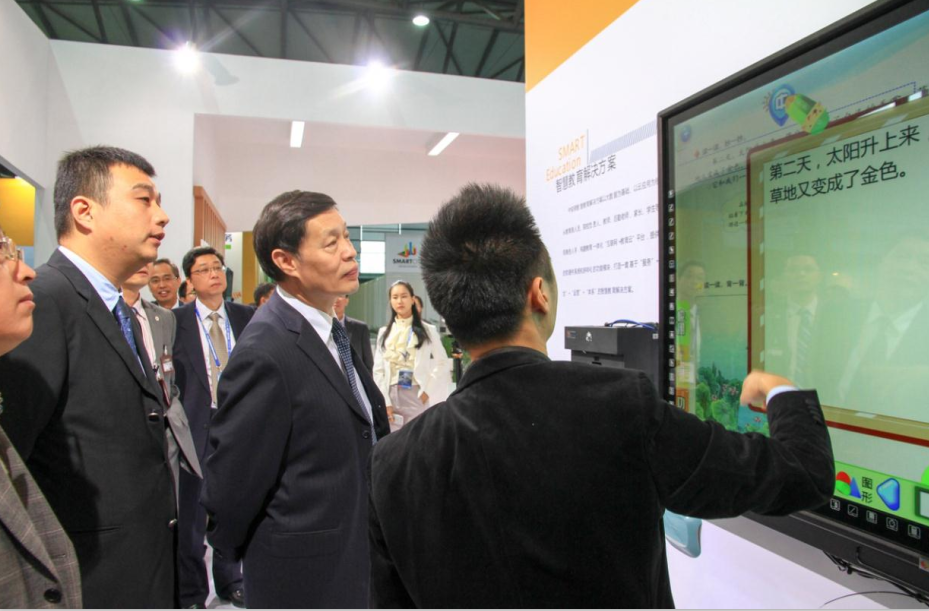 中安科股份副董事長(zhǎng)兼總裁周俠(左一)陪同住建部總工程師陳宜明(左二)參觀中安消智慧教育解決方案展臺(tái)
