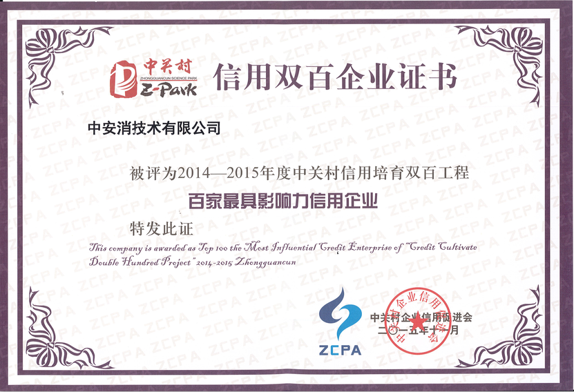 2015年11月17日,中關村企業(yè)信用促進會發(fā)布了“2015中關村信用雙百企業(yè)”獲獎名單,中安消技術有限公司憑借多年積累的社會信任度以及對中關村科技、經濟的貢獻,再獲 “2015年中關村信用雙百企業(yè)——最具影響力企業(yè)”稱號。