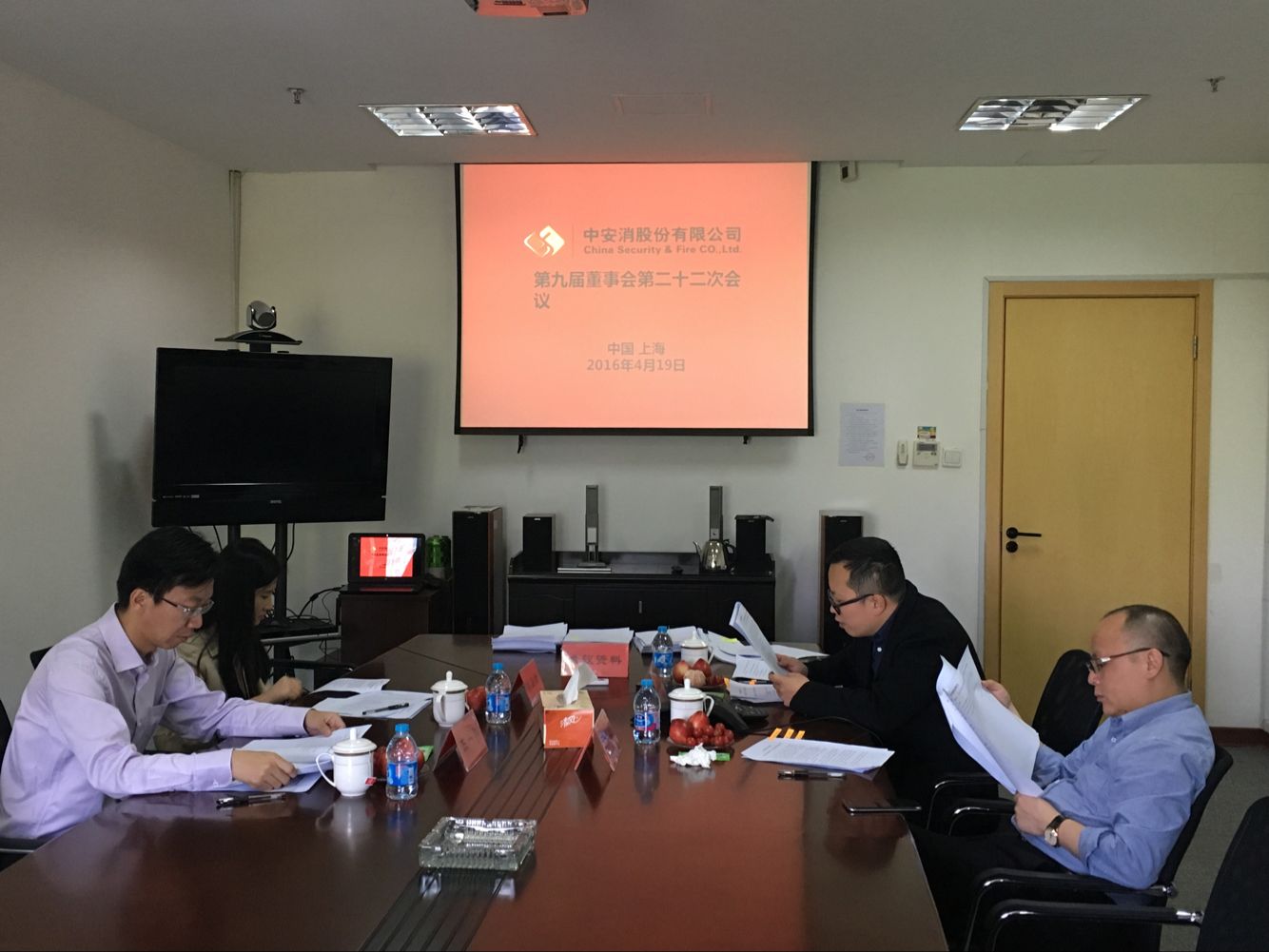 董事會(huì)會(huì)議現(xiàn)場(chǎng),右排:董事:吳巧民(右二);左排:監(jiān)事:王一科(左二)、陳亞南(左一);董事會(huì)秘書(shū)付欣(右一)