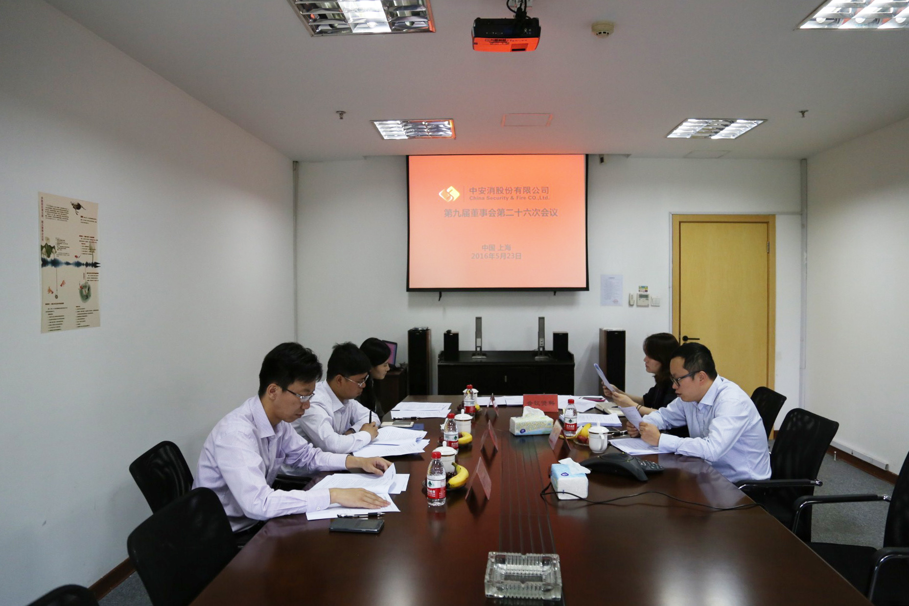圖2:董事會(huì)會(huì)議(上海會(huì)場(chǎng)):左排:監(jiān)事:王一科(左三)、吳展新(左二)、陳亞南(左一);右排:董事會(huì)秘書(shū):付欣(右二)、證券事務(wù)代表:劉小榕(右一)