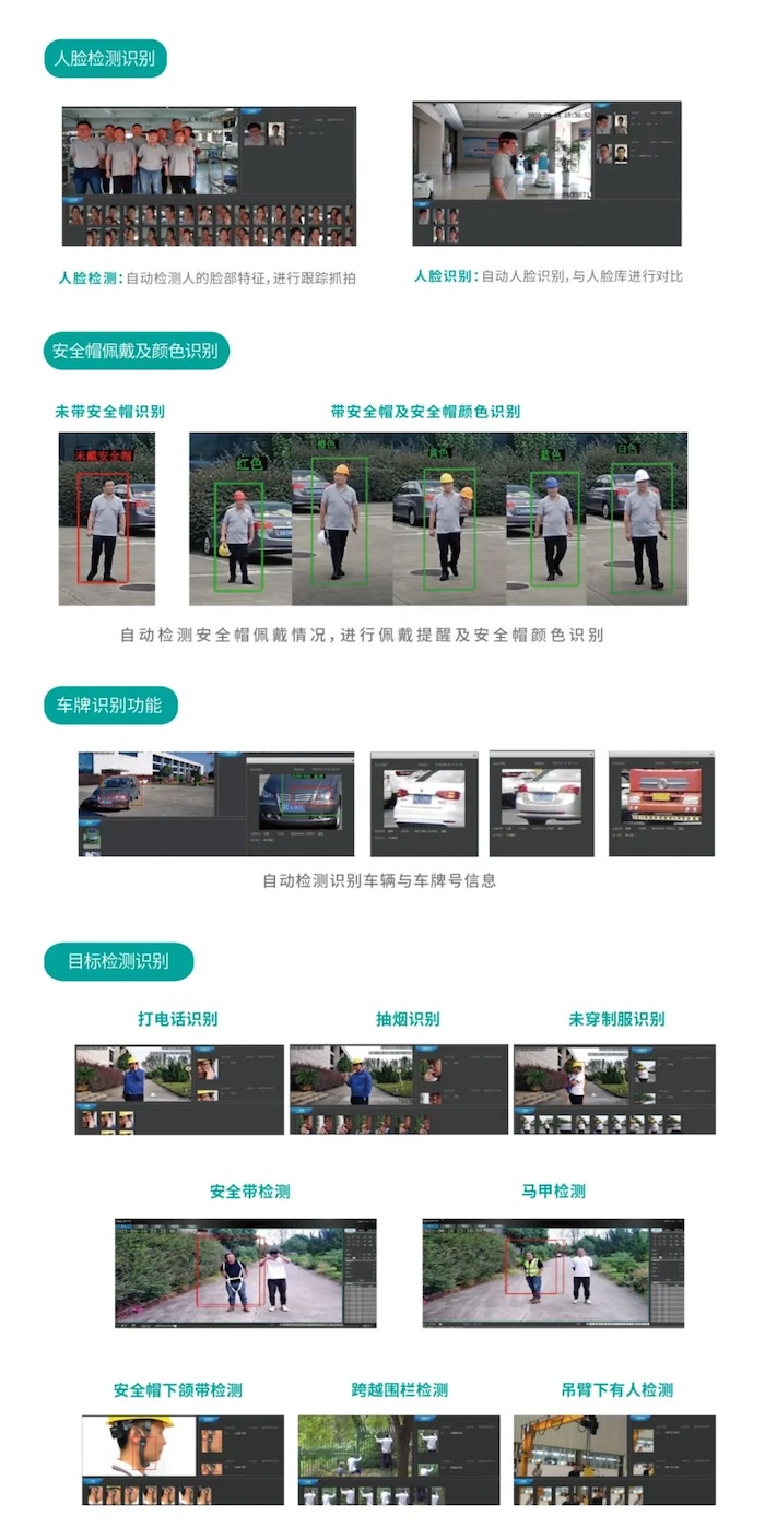 AI算法用于電力作業(yè)現(xiàn)場可實(shí)現(xiàn)人臉檢測、人臉識別、車牌識別、安全帽佩戴情況及安全帽顏色識別,以及打電話、吸煙、制服穿戴、安全帶佩戴、馬甲穿戴等多類目標(biāo)檢測識別功能。