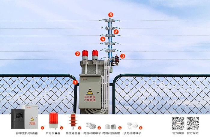 如遇強行入侵,電子圍欄將給予安全能量范圍內(nèi)的脈沖高壓打擊,警告非法入侵者,動搖其攀越圍欄的能力與動機。同時,系統(tǒng)現(xiàn)場發(fā)出高分貝聲鳴報警,并與其它安防系統(tǒng)聯(lián)動(如報警主機、監(jiān)控系統(tǒng)等),從而達到安全阻擋目的。